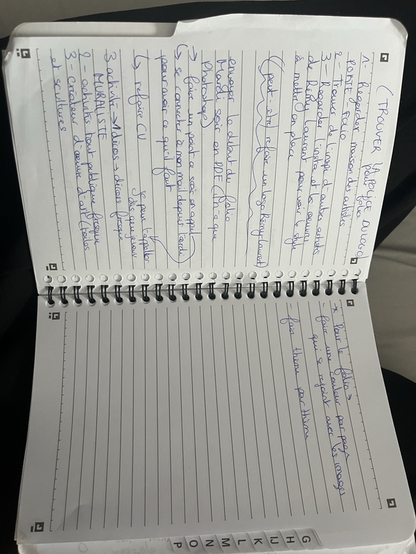 Pour cette seconde semaine de stage, j'ai envoyé le premier jet de mon portfolio à mon maître de stage et comme je m'y attendais ça ne lui convenait pas du tout, donc durant l'après midi il a pris de son temps pour tout revoir avec moi. Il m'a enfin donné des consignes avec plus de détails. Il m'a expliqué sa vision des choses, m'a montré son Instagram professionnel pour que je me base sur le style qu'il utilise d'habitude et m'a donné un tas de techniques et d'explications sur toutes les choses que je ne savais pas faire concernant InDesign et Photoshop (étant donné que j'ai moins utilisé Illustrator). J'ai donc tout pris en notes pour avoir la certitude de m'en souvenir et ai tout recommencé depuis le départ sur un nouveau fichier InDesign.