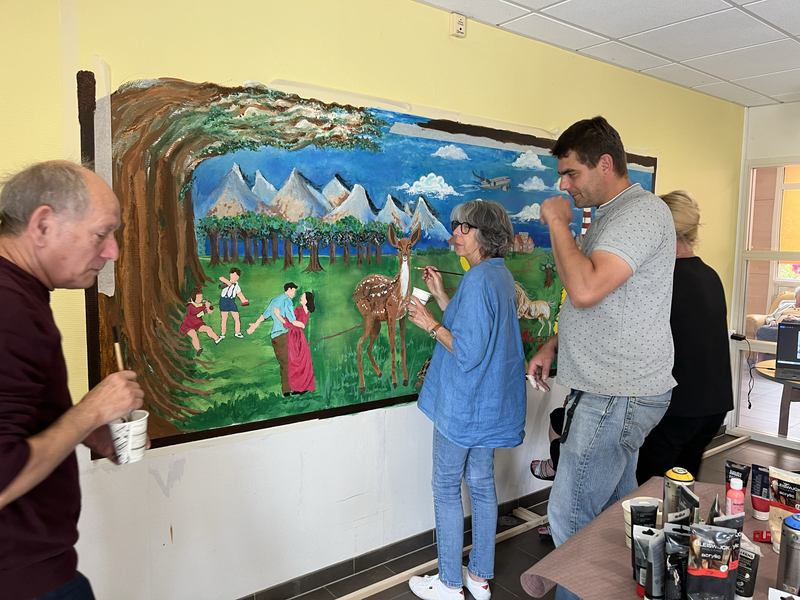 Pour cette quatrième semaine de stage toujours en parallèle avec la conception du portfolio et des logos, j'ai eu l'occasion de retourner à une activité artistique organisée par mon maître de stage mais cette-fois, ce n'était pas avec des enfants mais avec des personnes âgées dans un EPHAD, plus précisément à l'EPHAD Simone de Beauvoir à Saint-Médard-En-Jalles. Cette activité consistait à créer une fresque avec les éléments choisis par les résidents, celle-ci placée dans leur cantine. J'ai fortement apprécié cette seconde animation tout d'abord car cette fois ci j'ai pu participer a confectionner le projet mais sur tout car je me suis très bien entendu avec les résidents et leurs animateurs.